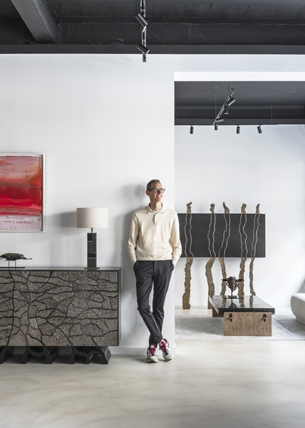 Derrière ses deux grandes portes en bois brûlé et bronze, l'espace de 150m² dédié au mobilier d'artiste est une invitation à découvrir l'excellence de l'artisanat breton. Y sont présentées des œuvres emblématiques telles que des cabinets en marqueterie de paille, des consoles en ébène, des commodes et miroirs en émail, ou encore des tables et guéridons en bronze.
